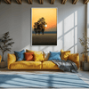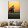 Warm orange, muted green, and golden yellow define Rise Over the Field. This canvas wall art portrays the beauty of sunrise behind distant trees across misty land. Balanced with soft neutral colors, this framed wall art radiates calm warmth perfect for entryways or living spaces.