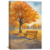 Golden hues, soft gray, and muted blue combine in Seat Among the Leaves. This canvas wall art captures a peaceful park bench beneath autumn trees. Its neutral tones and natural composition make this framed wall art a timeless accent for calm and welcoming interiors.