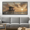Washed in warm neutrals, Horizon Watch captures a lifeguard tower at sunset, blending soft orange, grey, and brown tones. This tranquil coastal moment makes an ideal neutral-colored canvas wall art for a cozy, natural ambiance in any framed wall art collection.