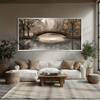 Calmly reflecting a golden-toned forest, a wooden arched bridge rises above a serene lake in this tranquil wall art. Crossing Still Waters features soft browns, muted beige, and creamy gray for a peaceful neutral palette. This canvas wall art invites elegance and balance into your space, perfect as framed wall art for any room seeking natural calm.