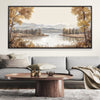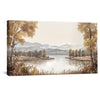 Elevate your interiors with the tranquil beauty of Meadow Mirror, a scenic canvas wall art showcasing a golden forest reflection over a still river. Featuring golden yellow, taupe, and soft gray, this framed wall art captures the harmony of nature through layers of trees and misty mountains in neutral colors. Perfect for rustic or nature-inspired themes, this peaceful wall decor brings warmth and depth to any space.