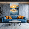 Golden yellow, deep blue, and muted green capture Fisherman’s Dusk, featuring a lone fisherman in a boat against a glowing evening sky. This canvas wall art combines neutral tones with vibrant highlights, creating framed wall art that adds calm, rustic charm and storytelling to any home space.