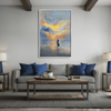 Brilliant sunset hues of orange, indigo blue, and golden yellow fill Where Sky Meets Soul, a canvas wall art showing a figure walking along the shore. Blended with neutral colors, this framed wall art evokes peace and reflection, ideal for bedrooms or serene living spaces.