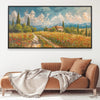 Capture the golden charm of Tuscan hills in "Red Blossoms of Tuscany." With hues of red, beige, and green and a neutral foundation, this canvas wall art showcases rolling fields, cypress trees, and a classic farmhouse—ideal framed wall art for cozy, worldly interiors.