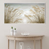 Flowing gently in the coastal breeze, this canvas wall art titled Seagrass Dreams invites a moment of peace. Featuring soft beige, sandy taupe, and pale green tones, the imagery of shoreline grasses swaying near the water is a soothing accent for modern or rustic decor. This framed wall art design uses calming neutral colors to evoke natural simplicity and coastal serenity.